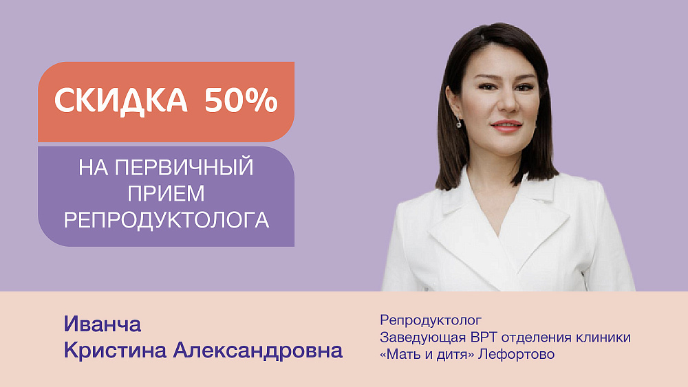 Рады сообщить вам, что у вас есть уникальная возможность записаться на приём со скидкой 50% к заведующей отделением ЭКО, врачу репродуктологу - Иванча Кристине Александровне.