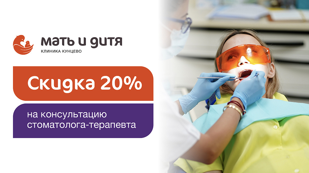Клиника «Мать и дитя» Кунцево предоставляет скидку 20% на консультацию стоматолога‑терапевта для взрослых при наличии действующего контракта на ведение беременности в любой клинике ГК «Мать и дитя».