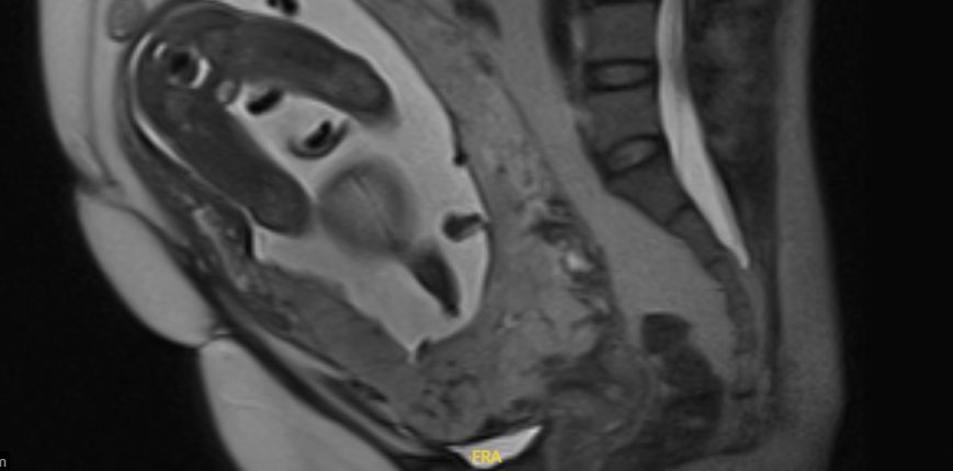На сроке 30 недель беременности МР-признаки врастания плаценты (p. increta), толщина стенки матки неравномерная: на расстоянии около 77 мм от внутреннего зева (где толщина стенки представляется от 4,5 до 9,6 мм с гиперваскуляризацией), на протяжении до 62 мм по длинной оси матки и около 92 мм, билатерально, толщина стенки составляет 1,6 мм. Задняя стенка мочевого пузыря прилежит к измененной стенке матки, дифференцировка мышечного слоя мочевого пузыря не нарушена, достоверных признаков распространения на мочевой пузырь не выявлено).